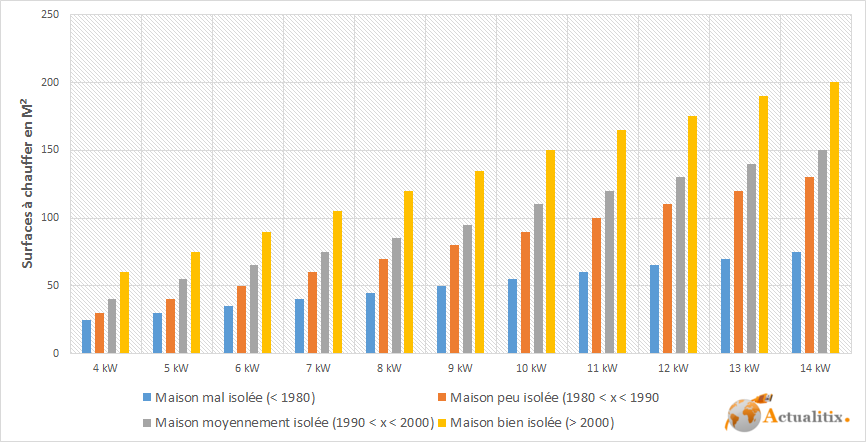 On constate dans le tableau ci-dessous qu’une maison mal isolée et construite avant 1980, même avec le poêle le plus puissant, pourrait chauffer au maximum 75m² quand une maison construite après 2000 peu en chauffer 200. En résumé, la surface n’est pas la seule donnée importante, l’isolation de la maison est également un facteur déterminant.