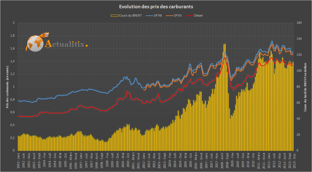 Les cours du Brent sont présentés sous la forme de barres et les données sont en dollars quand les trois carburants sont présentés sous la forme de lignes et en euros.
