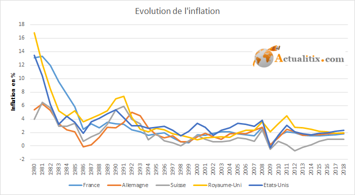 Cet article présente le taux d’inflation moyen par pays dans le monde. Le graphique situé un peu plus bas dans l’article présente pour sa part l’évolution de l’inflation dans 5 pays, la France, la Suisse, les Etats-Unis, le Royaume-Uni et l’Allemagne.