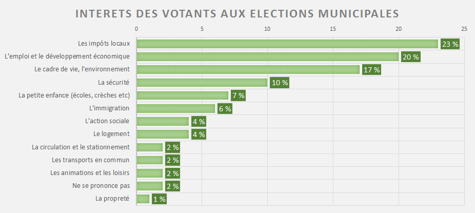 Comme on peut le constater sur le graphique ci-dessus la principale préoccupation des votants (selon le sondage) sera les impôts locaux avec 23 % soit près d’un quart des personnes. L’emploi et le cadre de vie viendront ensuite compléter le podium avec respectivement 20% et 17% des votants qui mettront ce critère en avant.