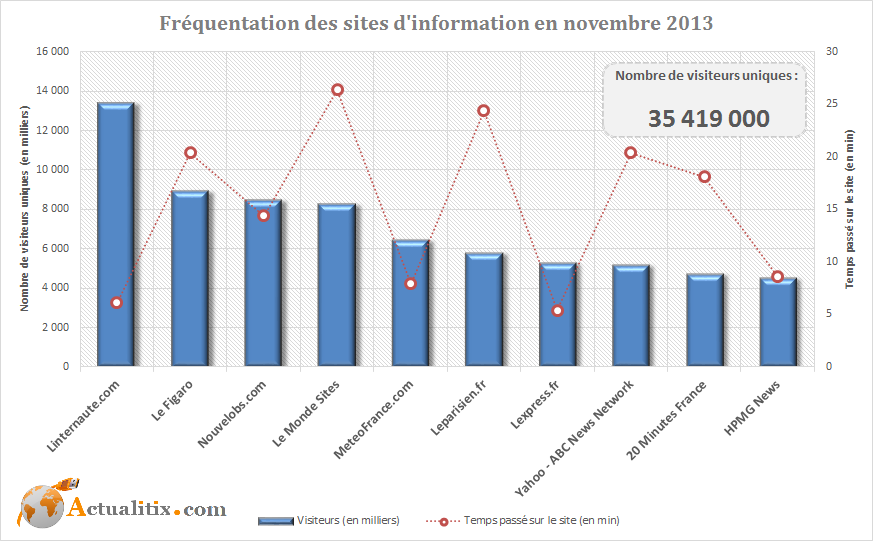 Les trois sites les plus visités selon la caractéristique du visiteur unique sont Linternaute.com avec environ 13,5 millions de visiteurs par mois, le Figaro suit avec environ 9 millions de visiteurs par mois et le Nouvelobs.com clôture le podium avec environ 8,5 millions de visiteurs pour le mois de novembre 2013 en France.