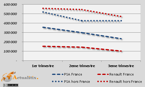 Sur le graphique on constate que chaque constructeur a vu sa production baisser en 2012 du fait de la crise économique. D’ailleurs, les deux groupes prévoient de licencier (ou geler les embauches) du personnel en 2013 pour passer la crise.