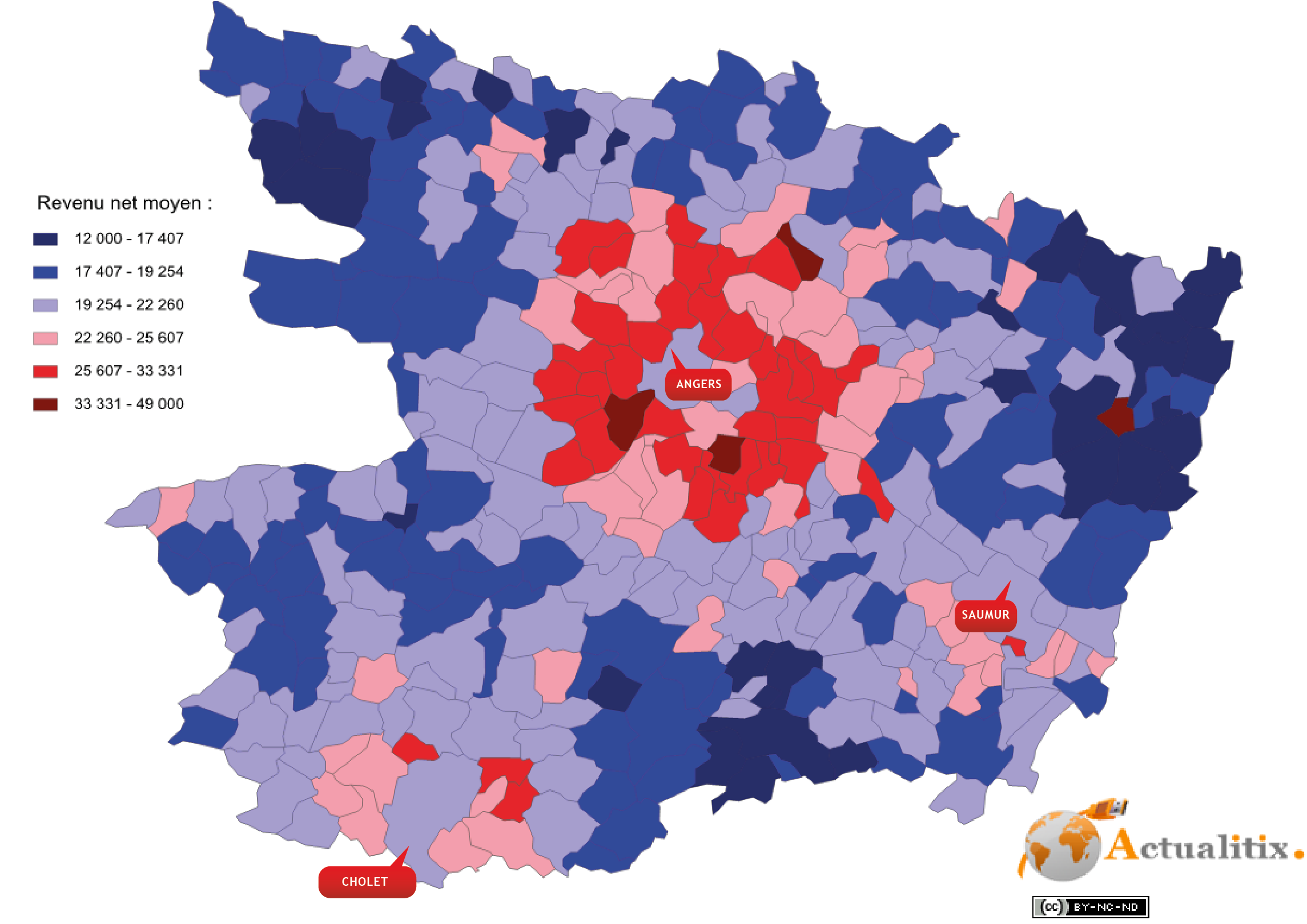 Sur la carte, on constate que les revenus nets moyens les plus élevés dans le Maine-et-Loire se situent principalement autour de la ville d’Angers.