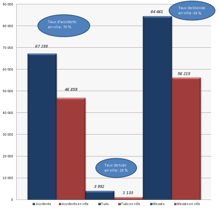 On constate ainsi que la majorité des accidents a eu lieu en ville, près de 70 %, mais que ceux-ci sont beaucoup moins mortels que ceux hors agglomération puisque 28 % des accidents en ville provoque un décès. Le taux de blessés est sensiblement égal au taux d’accidents avec 66 %.
