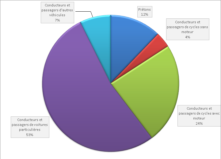 Voici un graphique présentant la répartition des tués sur les routes en France en 2010 en fonction du moyen de transport utilisé. On constate que la majorité des tués sur les routes le reste en voiture, c’est pourquoi l’amélioration de la technologie couplée au renouvellement du parc automobile peut nous faire espérer que la diminution du nombre de morts sur les routes continuera.
